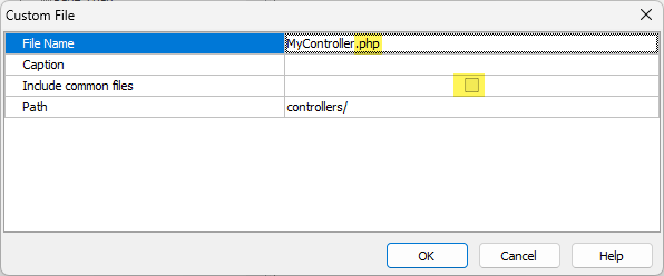 | Property | Value | |----------------|--------------------| | **File name** | **_*.php_ or other non-PHP files** | | **Includes common files** | **✘ DISABLED** | | **Path** | **Output folder relative to project folder (Required)** | The file is a **single** file, NO other related files (e.g. page class, controller and view) and no route will be generated, e.g.  In this case, the **Path** is the **output folder relative to the project folder**. For example, if your project folder is *D:\websites\myproject* and you want to generate the page in *D:\websites\myproject\myfolder*, then you should enter `"myfolder"` (no quotes, no leading slash, no parent path).