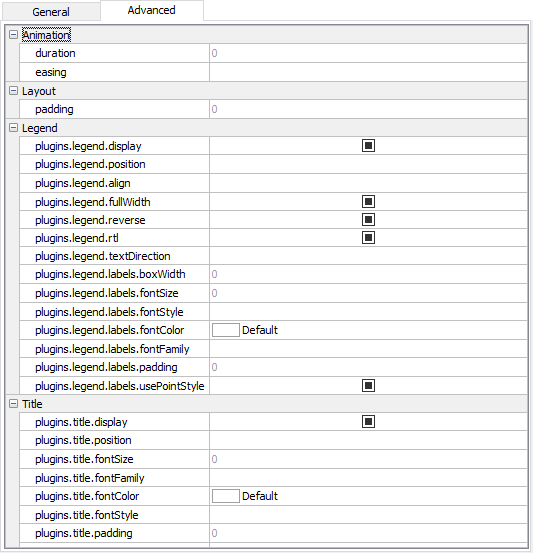 | Configuration | Additional chart configuration. You can add more configuration to the chart. This setting must be in JSON syntax, e.g. { options: { ... } }