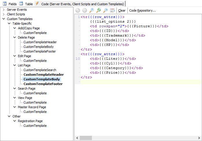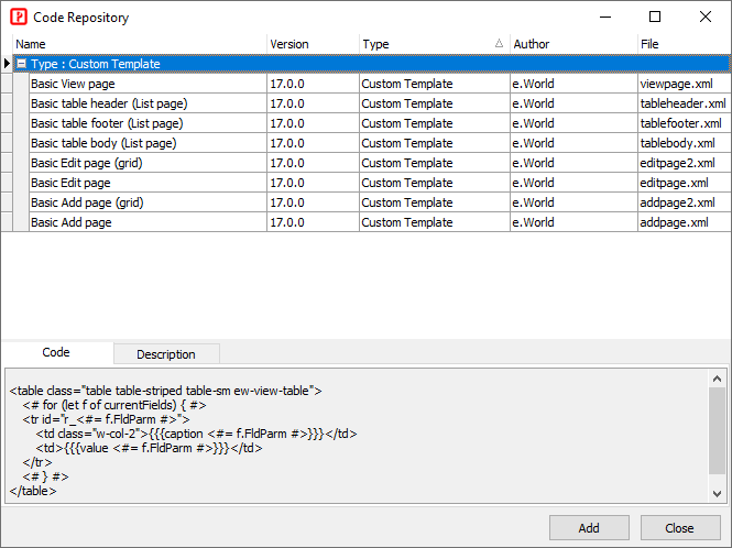 To let you create your Custom Templates easily, PHPMaker supports the following Custom Template Tags. Since JsRender template tags use {{ and }} (double curly brackets), in order to let you use them in your Custom Templates, PHPMaker Custom Template Tags use {{{ and }}} (triple curly brackets) to differentiate.