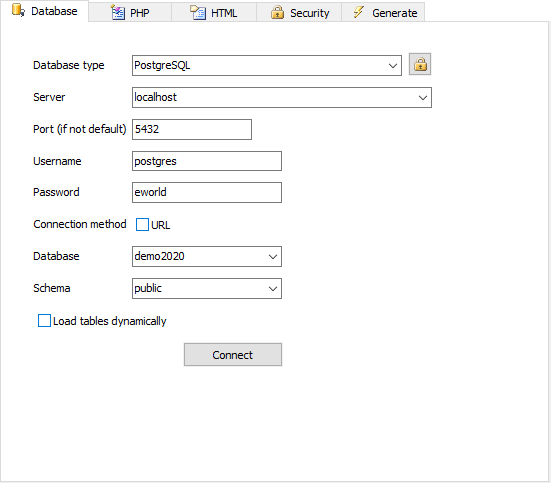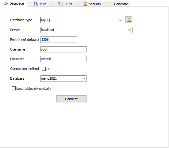 PHPMaker can connect to MySQL, PostgresSQL, Microsoft SQL Server, Oracle and SQLite. Click the