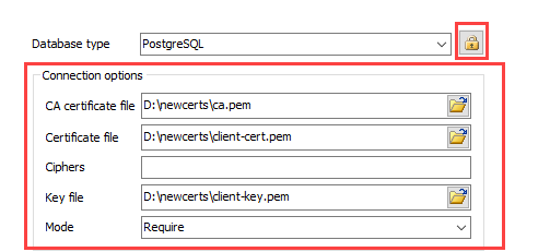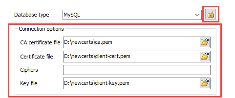 button (next to the Database type setting) and enter the additional connection options: