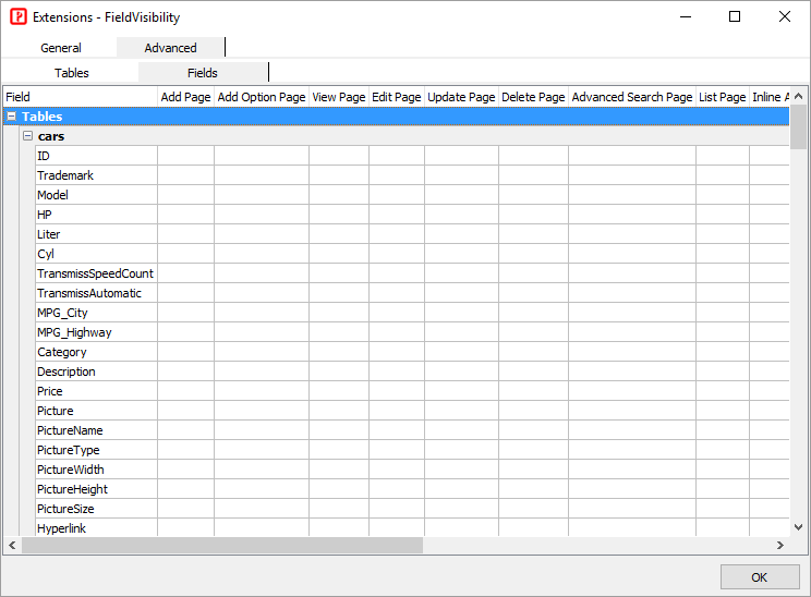 In the Advanced tab, you may see Project, Tables, and Fields tabs, depending on extensions. Note that NOT every extension has all 3 tabs, some extensions may have project level settings only, some extensions may have table or field level settings also, e.g.