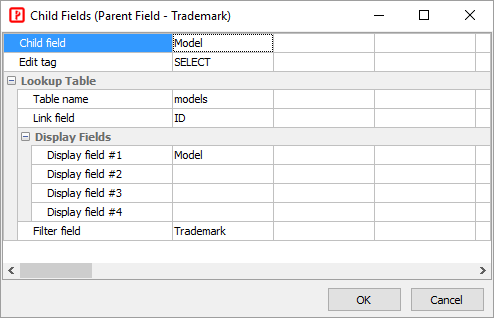 PHPMaker supports Dynamic Selection Lists in which child lookup fields' selection list options change dynamically based on option selected in the parent selection list. To setup child lookup fields, click the Child lookup fields... button and the following setup form will be displayed: