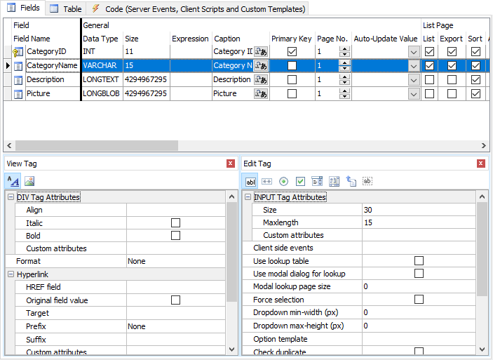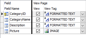 | View Tag | HTML tag to display the field for viewing (see below for details). Used in List/View pages. You can either click the [View Tag] column and select a View Tag from the drop down box or click the icon on the View Tag panel toolbar to select. After selecting the View Tag, you can further setup its properties in the View tag panel. |