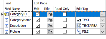 | Edit Tag | Form element for the field. Use in Add/Copy/Edit/Search pages (see below for details). You can either click the [Edit Tag] column and select a Edit Tag from the drop down box or click the icon on the [Edit Tag] panel toolbar to select. After selecting the Edit Tag, you can further setup its properties in the Edit Tag panel. |