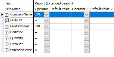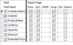 | Ext. Search | Use this field in Extended Quick Search. If a field is checked for Ext. Search, a form element for the field will be shown above the report for searching the report. |