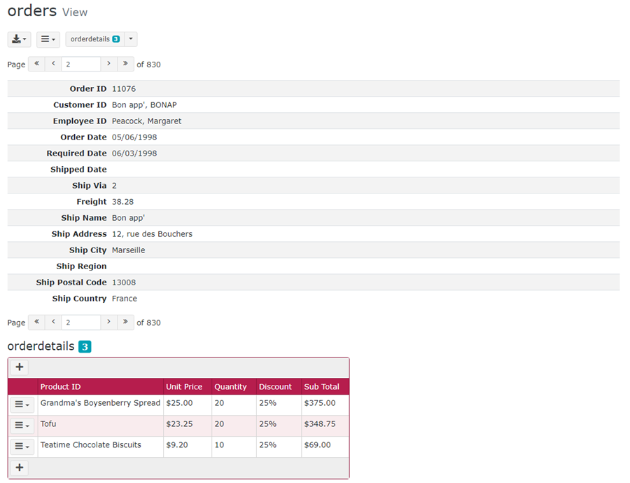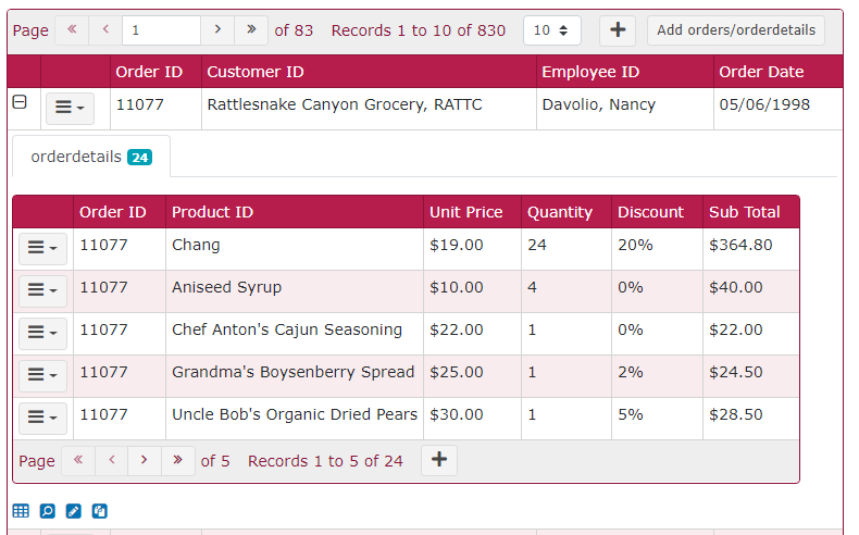 Click on the link to the "orders" table, there will be a new column for the "orderdetails " table. Click on the "orderdetails" button to access the order details for the selected record. Click the dropdown button and then click Master/Detail View, Master/Detail Edit or Master/Detail Copy to view/edit/copy and selected record and its detail records.