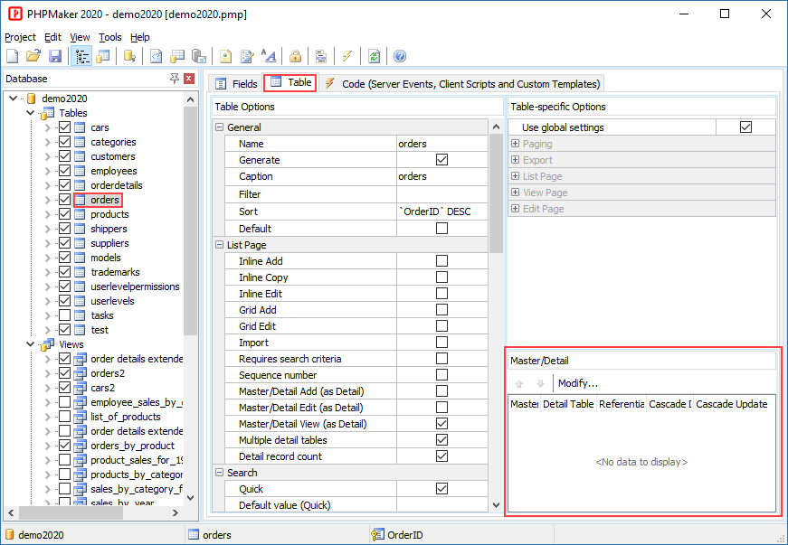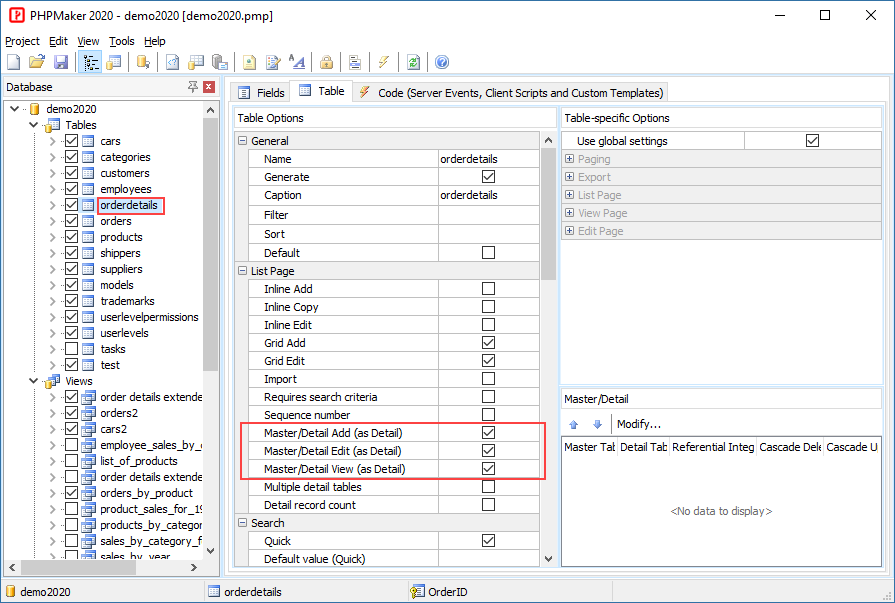 In this tutorial we will show you how to setup Master/Detail tables. In the demo database, there are two tables called "orders" and "orderdetails". We will set up the master/detail relation between these two tables.