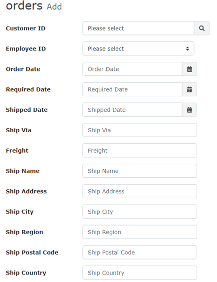 Click the Add orders/orderdetails button in the paging section, the Add page of the master table with a detail table grid of the detail table will be shown.