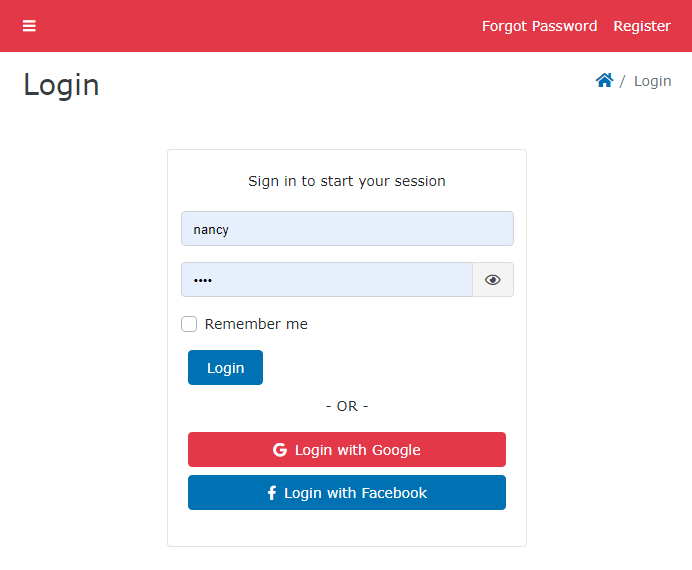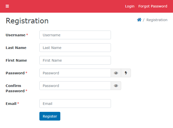 Click the "Register" link, you will be redirected to the registration page. Note that a "Confirm Password" field and JavaScript validation are added automatically.