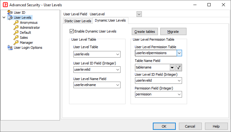 If you have projects created by previous versions of PHPMaker you may want to use dynamic User Levels and migrate the previously defined static User Levels in the project to the database. After selecting or creating the User Level and User Level Permission tables/fields, just click the Migrate button to let PHPMaker do that for you.