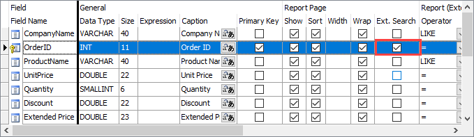We also enable Extended Search for the OrderID so we can select an order from the report before we export it: