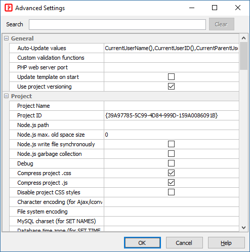 Advanced Settings are some advanced general settings for PHPMaker, or some rarely changed settings for the project, or custom defined settings for use during code generation. Click Tools -> Advanced Settings to change these settings.