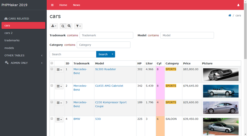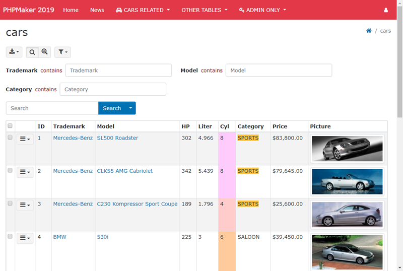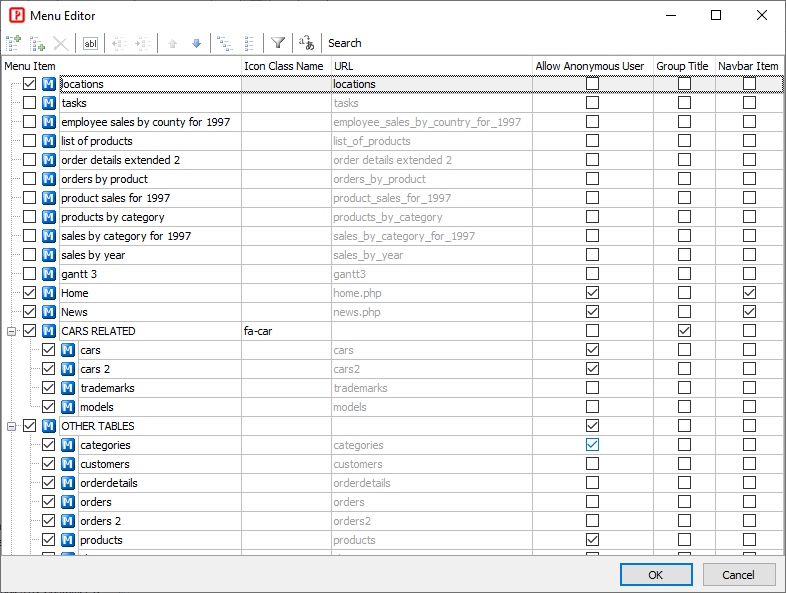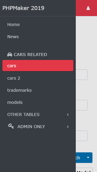 PHPMaker allow you to modify the menu in the generated site, to open the menu editor, click Tools -> Menu Editor in the main menu or click the "Menu Editor" icon in the toolbar.