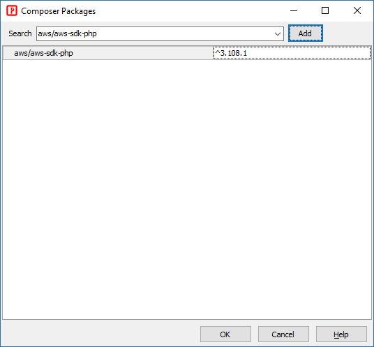 You can add your Composer packages to the project. Search for the package you want in the Search box, select and then click the Add button to add the package to the project. The latest version will be inputted automatically. If you need to use other version, enter your version number manually.