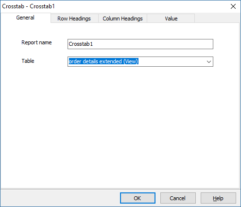 PHPMaker will give the new report a temporary name, Crosstab<n>, where n is an integer. If you want to change the name, enter a new name in the Report name edit box. Then you can select a table or a view from the Table combobox.