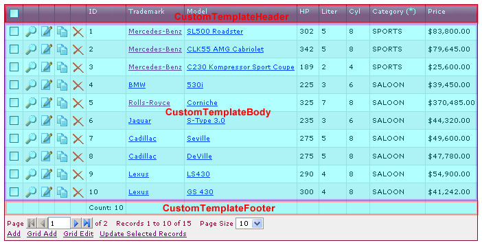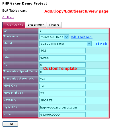 By default fields are presented in tabular form, e.g. one field per row in Add/Edit/Search/View page, or one record per row in List/Delete page. Custom Templates enable you to re-arrange the fields in your own way.