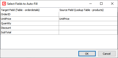 If properly set up, when the user changes the selected value of the field, the scripts will try to use other field values (specified by [Source Field]) of the selected record (from the lookup table) to fill the target fields of the current table (specified by [Target Field]) automatically.