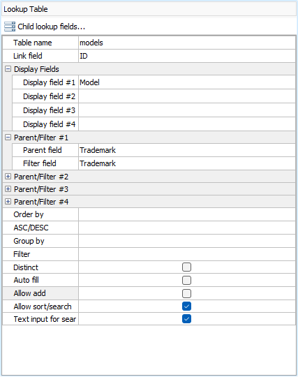 Parent/Filter #4 Optional. For use with dynamic selection lists. The 4th pair of parent field and filter field. If setup, the filtering of lookup table records will be based on 4 fields.