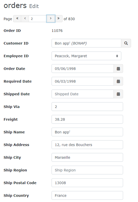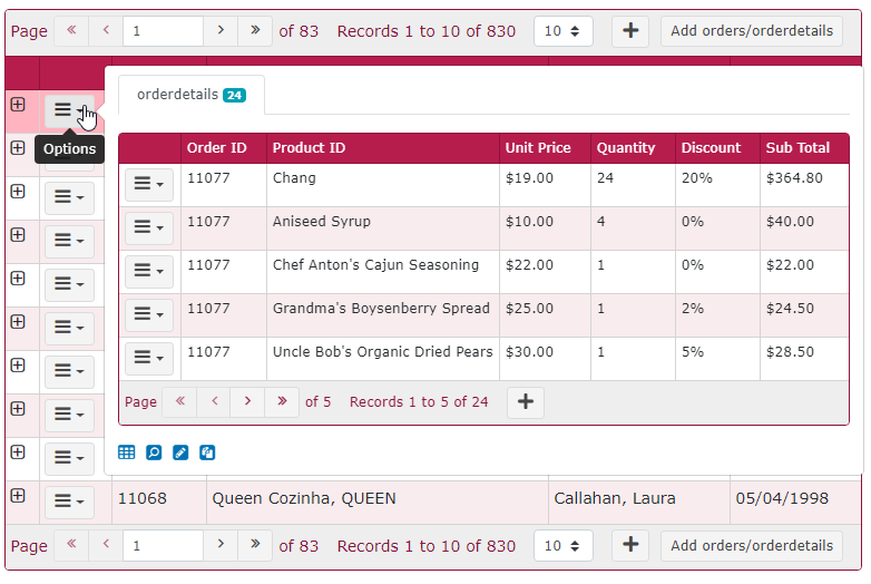 Click on the link to the "orders" table, there will be a new column for the "orderdetails " table. Click on the "orderdetails" button to access the order details for the selected record. Click the dropdown button and then click Master/Detail View, Master/Detail Edit or Master/Detail Copy to view/edit/copy and selected record and its detail records.
