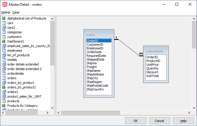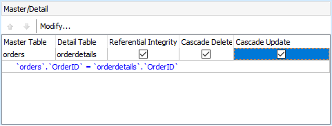 In this tutorial we will show you how to setup Master/Detail tables. In the demo database, there are two tables called "orders" and "orderdetails". We will set up the master/detail relation between these two tables.