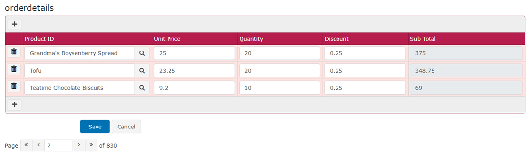 Click the Add orders/orderdetails button in the paging section, the Add page of the master table with a detail table grid of the detail table will be shown.