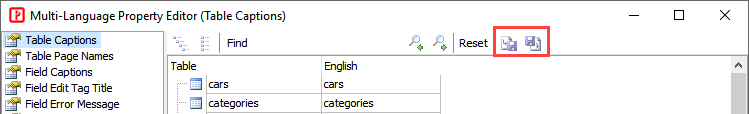 To edit these properties, click Tools -> Multi-Language Property Editor to open the editor. Alternatively, you can also click the small button next to above properties in the user interface to open.