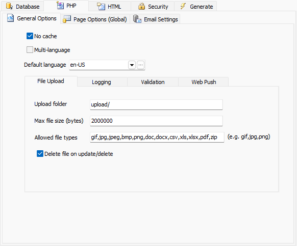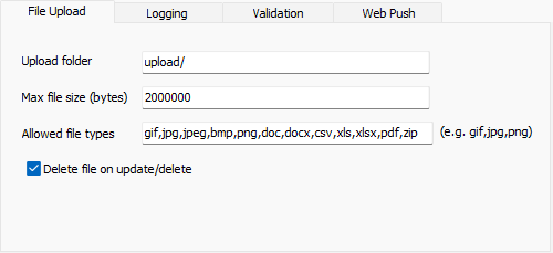 Allowed file types - The allowed file extensions of the uploaded files. Separate the file extensions (without ".") by comma without space, e.g. gif,png,png. If blank, all file types are allowed. Delete file on update/delete - Option to delete the uploaded file when the field value is replaced, removed or if the record is deleted. Note