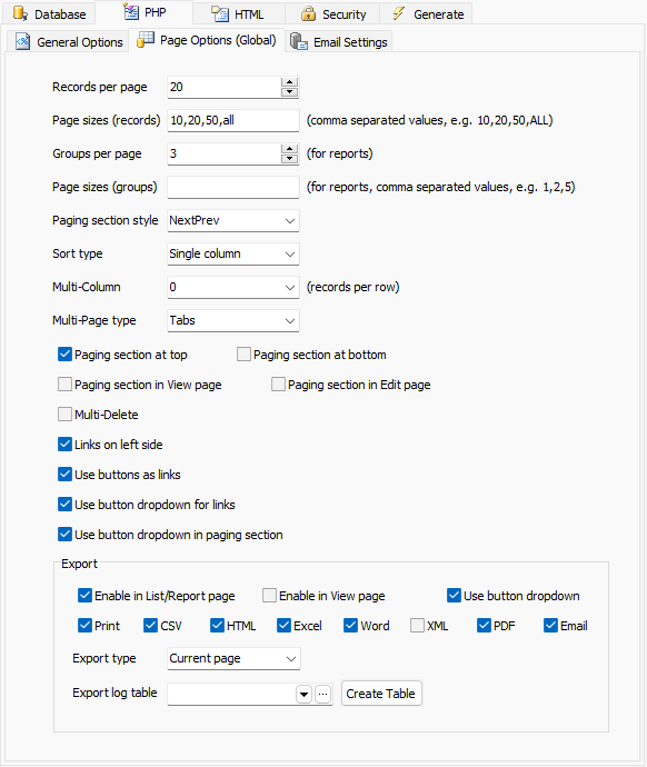 The following page options are global for all tables. If you want different settings for a particular table, you can use table-specific options available in the Table Setup page.