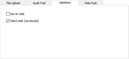 Server-side - Enable server-side form validation. Client-side (JavaScript) - Enable client-side form validation. Note If the available validation format in the