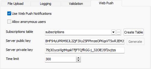 You can create the database yourselves and select the table in the combobox, then click the [...] button to select the fields in your table. Alternatively, if you have not created the table yet, you can click Create Table button to create the table and setup the table/fields. Server public key - Web Push VAPID public key You can create the Server public/private key pairs by clicking the Generate button. Note The Generate button is only enabled if both keys are empty. If you want to generate again, clear both keys first. Time limit - Time limit (in seconds) for sending the Web Push Notification See Web Push Notification for more information. |