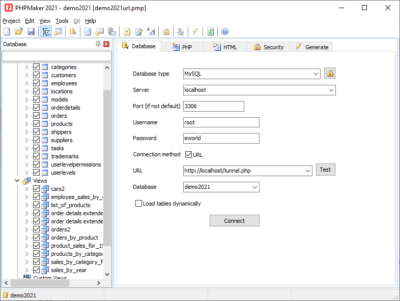 In this tutorial we will show you how to use the new connection method which can connect to a remote database (MySQL) using a PHP script provided by PHPMaker.