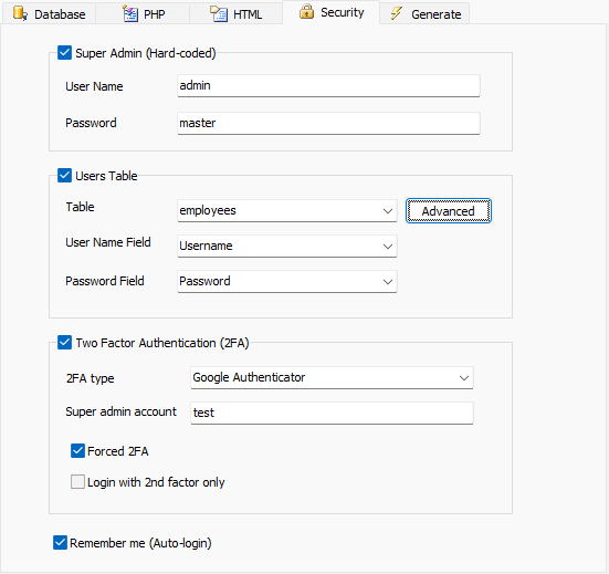 Advanced Security feature allows you to setup User ID, assign User Levels to users and create a complete user registration system. To setup, click the Advanced button.