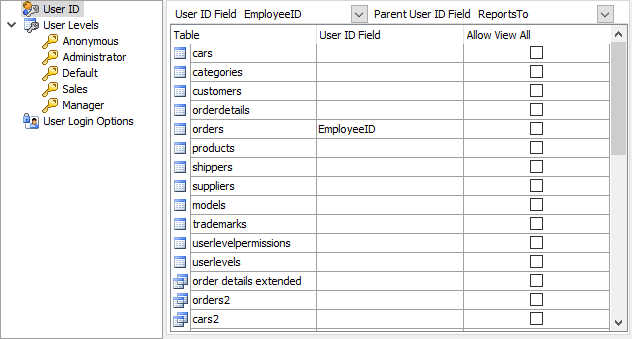 User ID Security secures data at record level. Protected tables must have an User ID field for identifying which user a record belongs to. The User ID field names can be different in tables though. When User ID security is enabled, users can only access their own data.