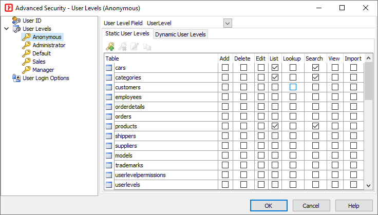 PHPMaker supports two types of security - User ID and User Level. User ID Security secures data at record level. User Level Security secures data at table level. They complements each other and they can work independently or together. Users get their User ID and User Level after login. Before login, an user's identity is unknown and the user is an Anonymous User.