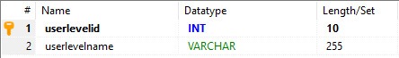 The User Level Table and User Level Permission Table must have the following fields, note the data types, User Level ID and the Permission fields must be of integer type, the field names can be different though: