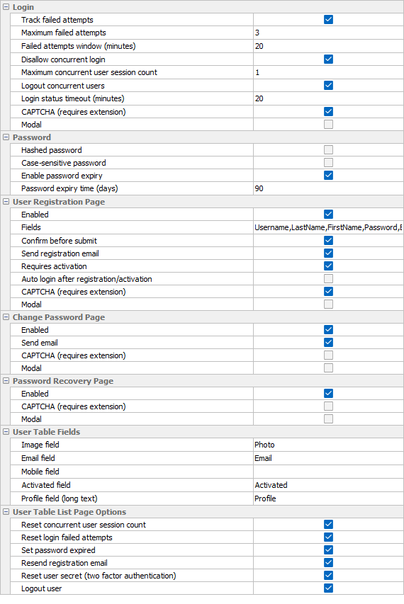 | Reset user secret (two factor authentication) | If enabled, a new option is generated in the User Table list page for the administrator to reset the user secret for two factor authentication. See Two Factor Authentication for details. |