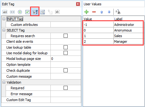 If you go to Field Setup Page now and view the Edit Tag for the User Level Field, you should see that the Edit Tag has been setup as SELECT and the user levels have been added automatically in the value list: