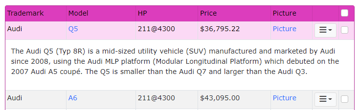 | Preview Field | Specifies if a field value should be shown in an expanded table row when a data row is clicked. For table view only, Multi-Column List page (cards view) is not supported. Default is disabled. If enabled, a table row will be shown/hidden on click, e.g.![]() |