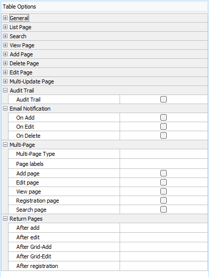 | Add | If enabled, an Add page for the table will be generated (for adding a record). Default is enabled. |