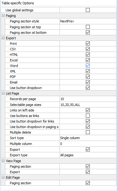 These options are same as the List page options as described in PHP Settings except that the options are table-specific, meaning that you can have different List page options for different tables. To use table-specific options, select a table in the grid, uncheck Use global settings in the Table-specific Options panel, the panel will be enabled for you to setup.