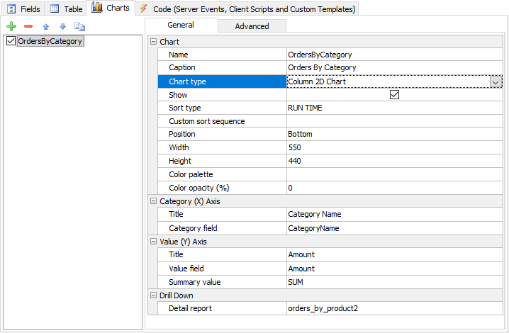 Enter chart Name (preferably alphanumerical characters only) as "OrdersByCategory"and Caption as "Orders By Category".