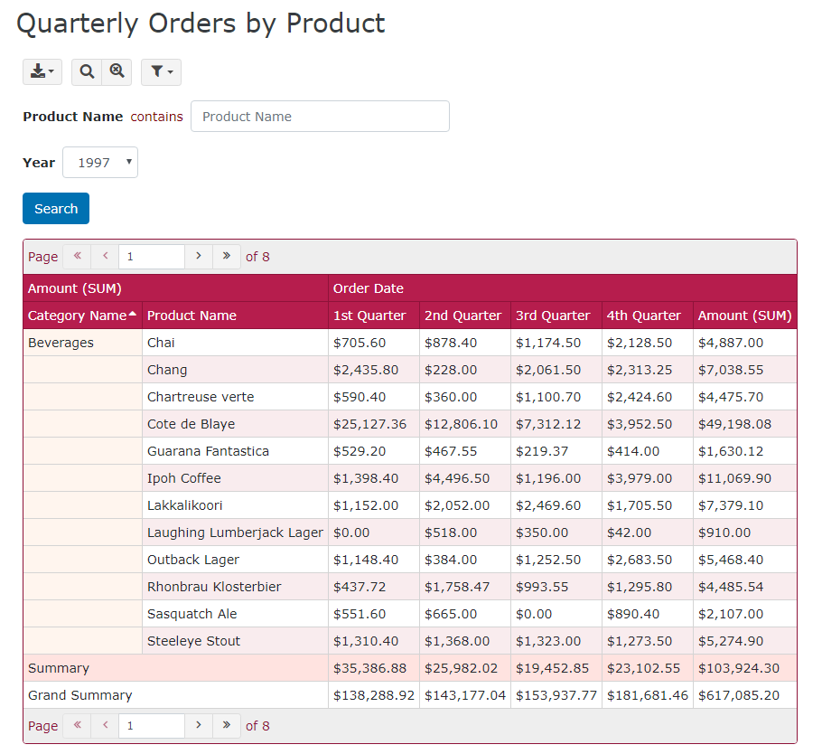 In this example, however, we did not filter the data in the view, the data includes orders for more than one years. If your group by "Quarter", orders in the same quarter but different years will be grouped together. That is usually not what you want, so we enable the Year filter feature, PHPMaker can create a combobox of the years according to the data and display data for a year at a time.