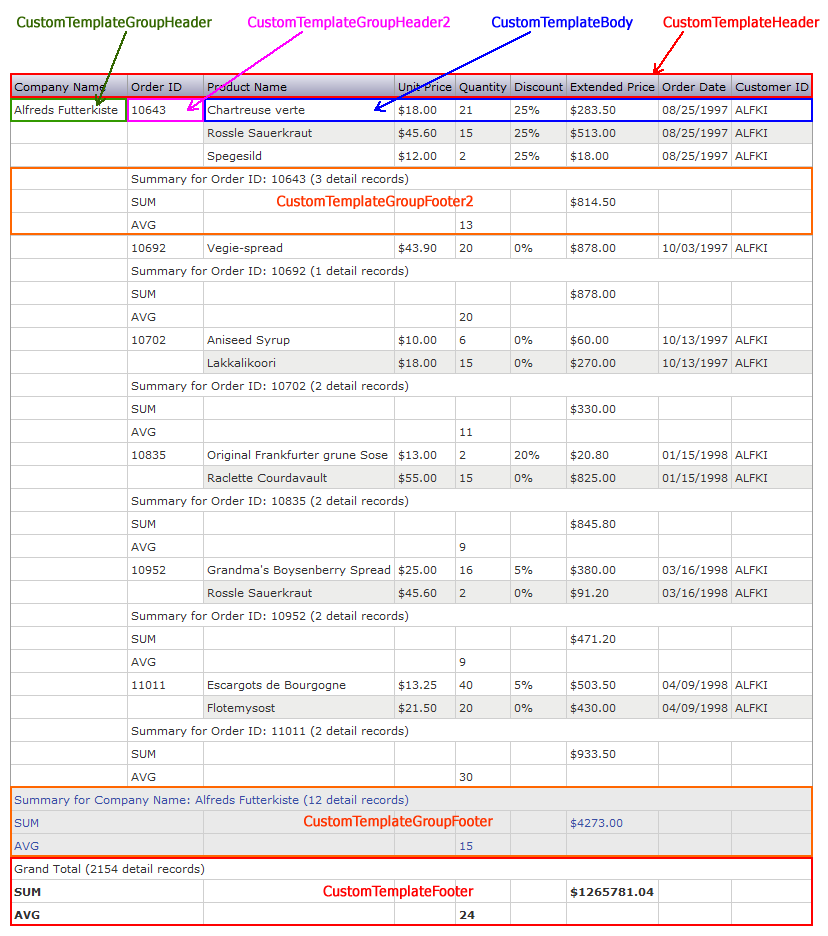 CustomTemplateGroupFooter<n> This is the group footer for the 1st to 6th group (where n = 2-6). For Summary reports only.
