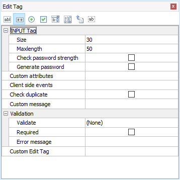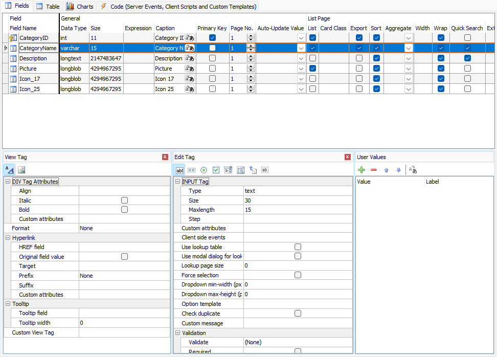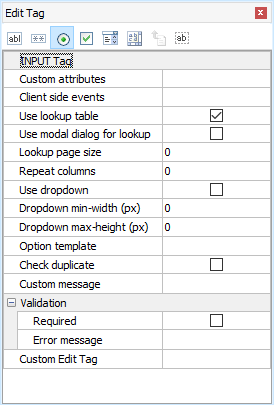 View Tag HTML tag to display the field for viewing (see below for details). Used in List/View pages. You can either click the [View Tag] column and select a View Tag from the drop down box or click the icon on the View Tag panel toolbar to select. After selecting the View Tag, you can further setup its properties in the View tag panel.