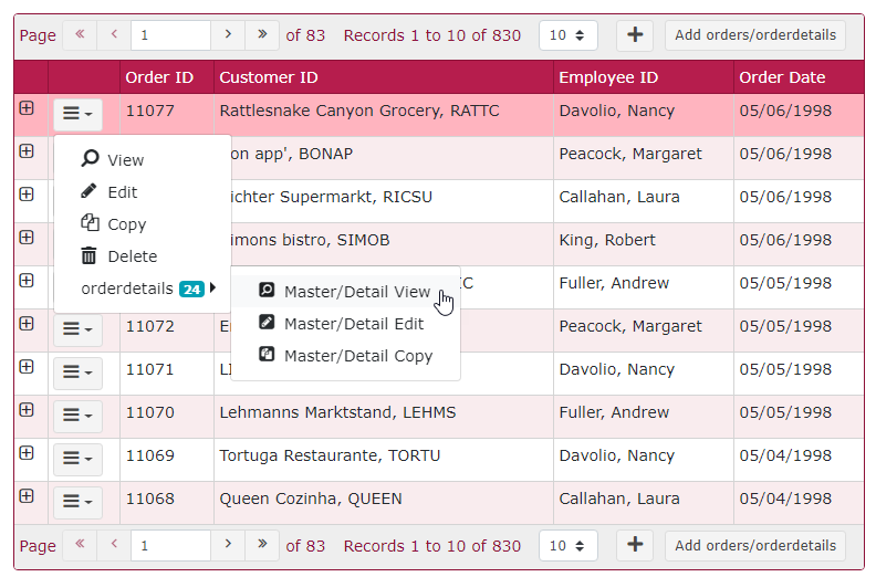 Click on the link to the "orders" table, there will be a new column for the "orderdetails " table. Click on the "orderdetails" button to access the order details for the selected record. Click the dropdown button and then click Master/Detail View, Master/Detail Edit or Master/Detail Copy to view/edit/copy and selected record and its detail records.