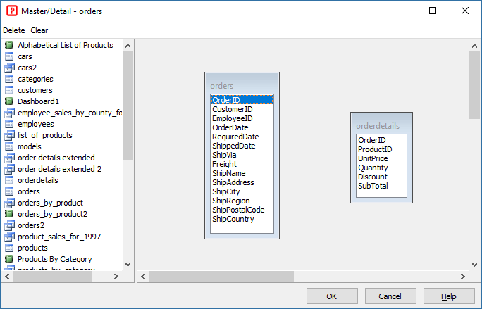 In this tutorial we will show you how to setup Master/Detail tables. In the demo database, there are two tables called "orders" and "orderdetails". We will set up the master/detail relation between these two tables.