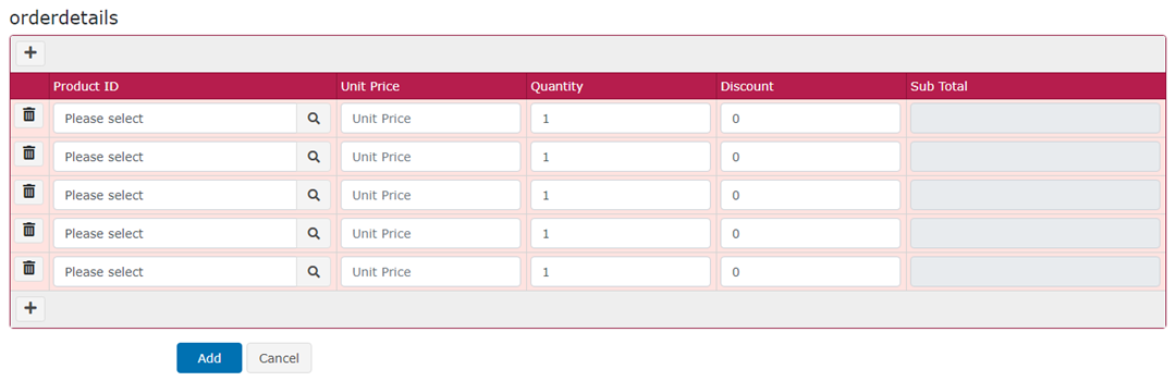 Click the Add orders/orderdetails button in the paging section, the Add page of the master table with a detail table grid of the detail table will be shown.