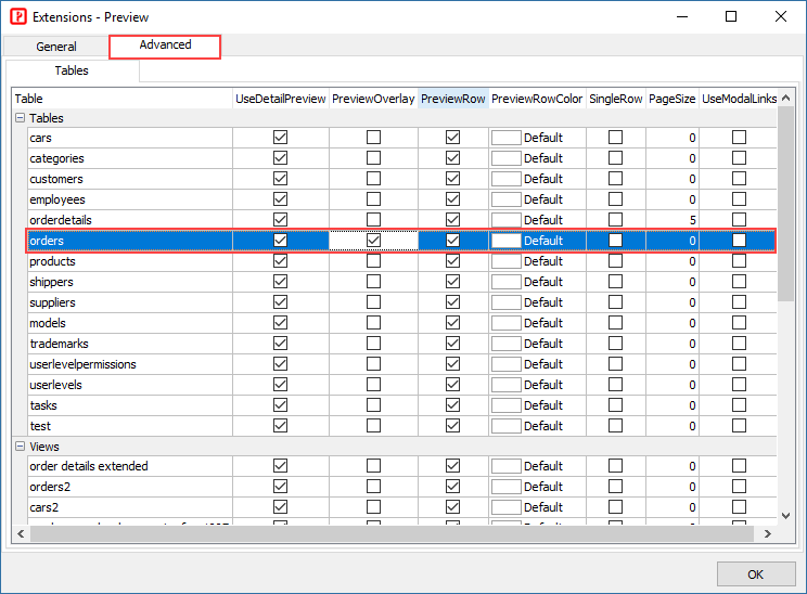 Enable the extension and then click the Advanced tab to set your settings for each table:
