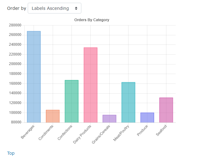 Click the "Reports" menu button and select "Quarterly Orders by Product" (or select the sub-menu "Orders By Category") to run the report and see the chart.
